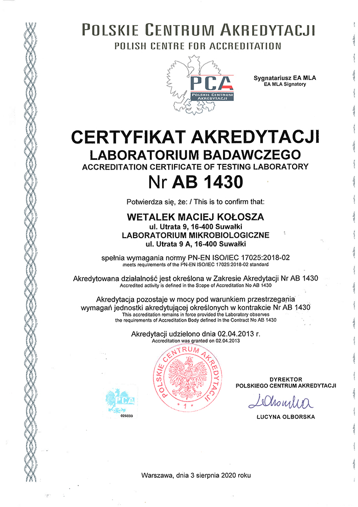 W laboratorium wdrożono i ciągle doskonali się System Zarządzania gwarantujący spełnienie wymagań normy PN-EN ISO/IEC 17025 oraz wymagań określonych w dokumentach Polskiego Centrum Akredytacji celem zapewnienia wysokiego poziomu jakości i wiarygodności wykonywanych badań.